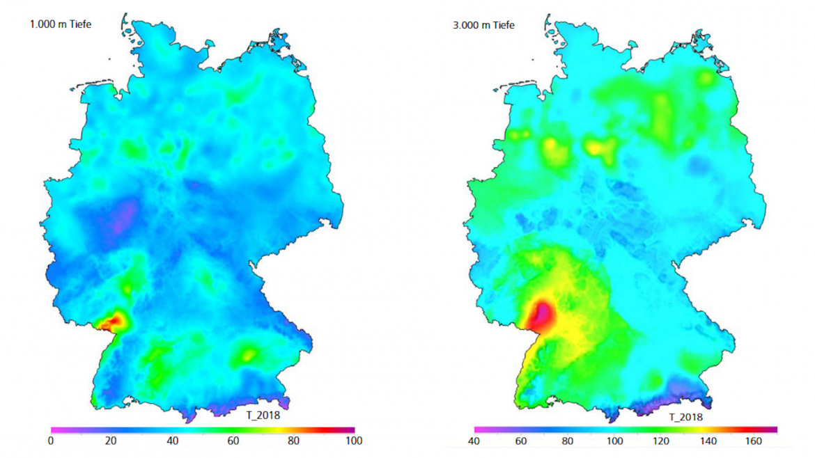 Temperaturen in Deutschland in 1.000 und 3.000 m Tiefe. © Agemar LIAG
